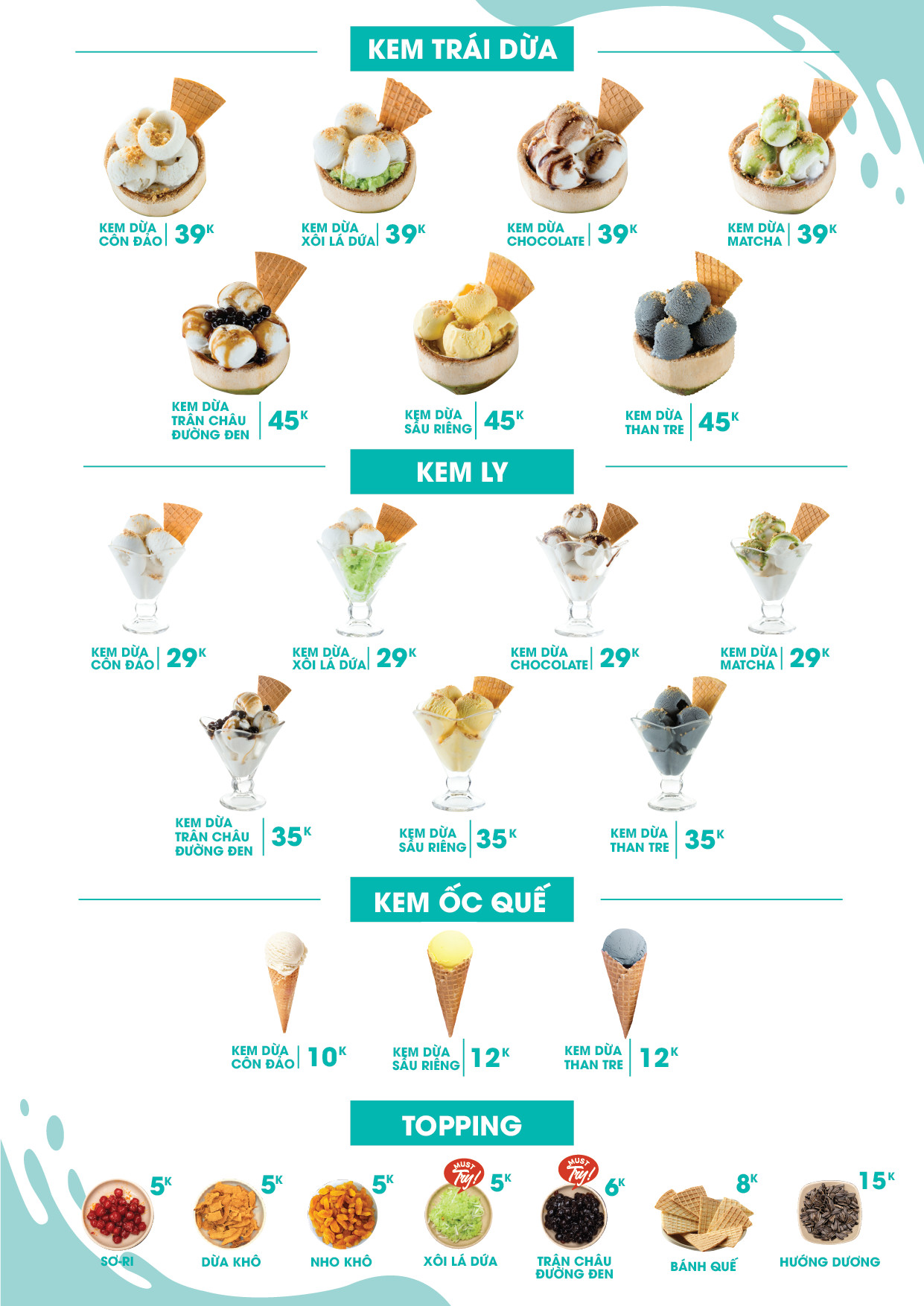Cocoo xây dựng hệ thống menu đa dạng với các hương vị chủ đạo từ trái cây nhiệt đới của mùa hè cũng như các dưỡng chất tốt cho sức khỏe như: Sầu riêng, Than tre, Matcha... ngoài ra xen kẽ những vị kem độc đáo hiện đại như: Kem dừa trân châu đường đen, Kem dừa xôi lá dứa... Menu kem liên tục được cập nhật theo thị hiếu thị trường, mở rộng chủng loại, giúp cho khách hàng thoải mái đưa ra sự lựa chọn của mình.